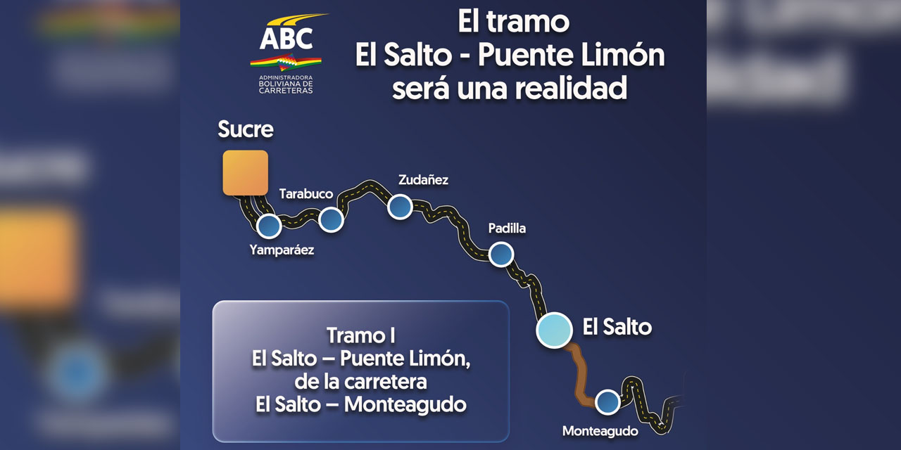 La Administradora Boliviana de Carreteras (ABC)destacó que el tramo El Salto-Puente Limón, en Chuquisaca, será una realidad con la aprobación en la Asamblea Legislativa del crédito de Bs 463 millones, gestionado por el Gobierno con CAF - Banco de Desarrollo de América Latina y el Caribe.