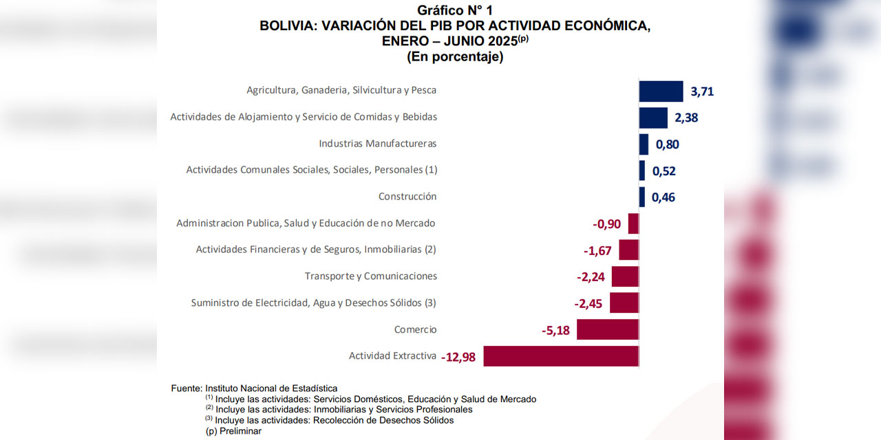 “Al primer semestre de 2025, Bolivia registró una tasa de crecimiento negativa de 2,40 por ciento (...). Producto de la coyuntura política desfavorable, el exceso de bloqueos que tuvimos en el país, tanto en marzo como en mayo y junio de 2025, que no solamente afectaron al transporte, sino también a toda la cadena productiva en general, encontramos que transporte, actividades inmobiliarias registran, junto con el comercio, tasas de crecimiento negativas”, afirmó el director del Instituto Nacional de Estadística (INE), Humberto Arandia, en conferencia de prensa.