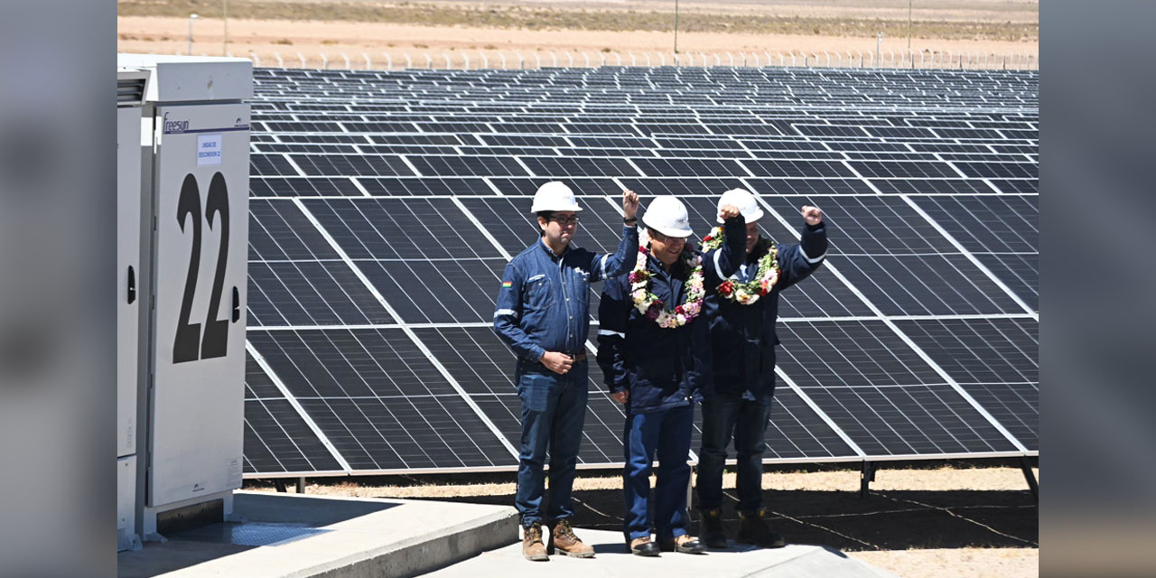 “Estamos probando una nueva tecnología más eficiente. Aprovechamos la radiación solar, pero también el rebote en suelo. Los nuevos paneles solares también captan el rebote de la energía solar, y eso es una innovación que está aumentando la eficiencia del nuevo proyecto de la planta solar en Uyuni”, explicó el mandatario.
