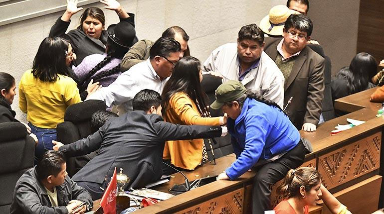 Evistas se suben a la testera de Diputados para frenar una sesión.