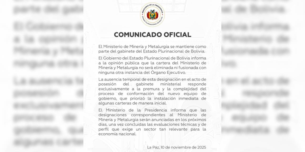 El Ministerio de Minería y Metalurgia se mantendrá en la estructura del Órgano Ejecutivo y la falta de designación de la autoridad responde a la premura y complejidad de conformación del gabinete del presidente Rodrigo Paz, establece un comunicado del Ministerio de la Presidencia.