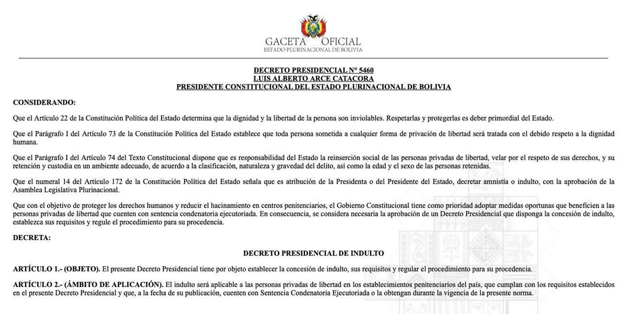 “Desde hoy entra en plena vigencia el Decreto Presidencial 5460, aprobado por Resolución de la Asamblea Legislativa Plurinacional. Esta norma establece las condiciones para la concesión de indultos, así como los requisitos y el procedimiento para su otorgación”, escribió el mandatario en sus redes sociales.