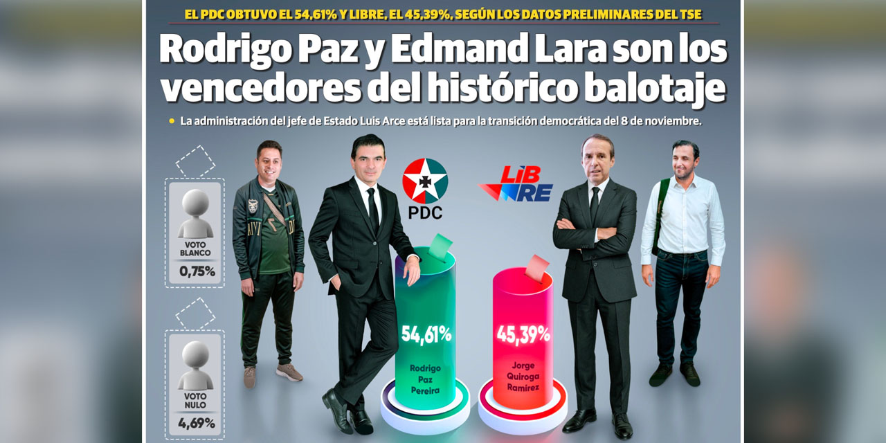 El histórico balotaje electoral en Bolivia dio la victoria al binomio del Partido Demócrata Cristiano (PDC) conformado por Rodrigo Paz Pereira y el expolicía Edmand Lara, quienes se impusieron con más del 54% de los votos a Jorge Quiroga y Juan Pablo Velasco, de la alianza Libre.